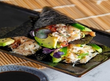 Spicy tuna, crabmeat, avocado, mango, and jalapeno wrapped in Rice Paper. topped with yellowtail, salmon, lemon, special ponzu sauce.